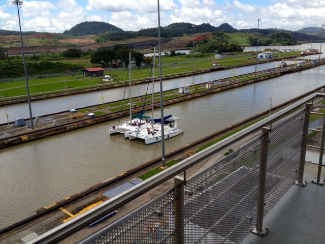 Here are two catamarans tied together entering the Miraflores locks. There are four line handlers on the boats and four line handlers on land.