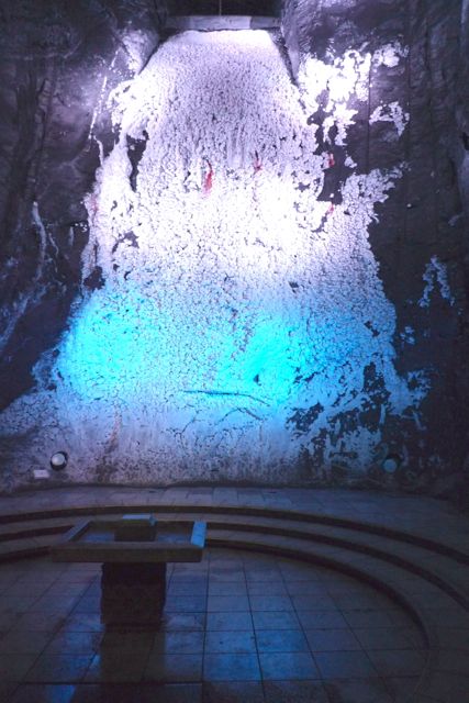 In the nave that is used for weddings and baptisms, the architects did a very clever thing. They used water to precipitate the salt out of the halite rock to create a pretty white cascade.