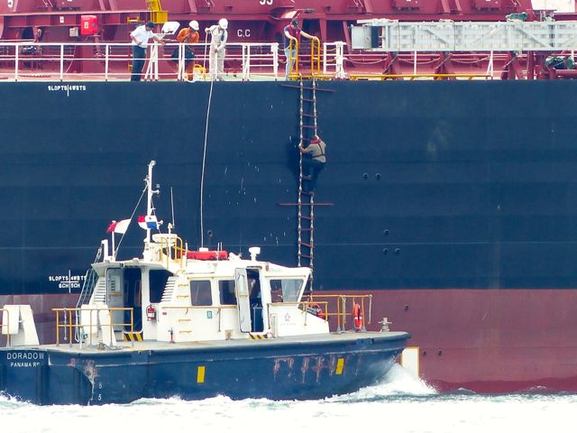 While waiting for our advisor, we watched a Canal pilot get off a freighter completing its transit. The little boat matched speed with the freighter and the pilot climbed down a long ladder.